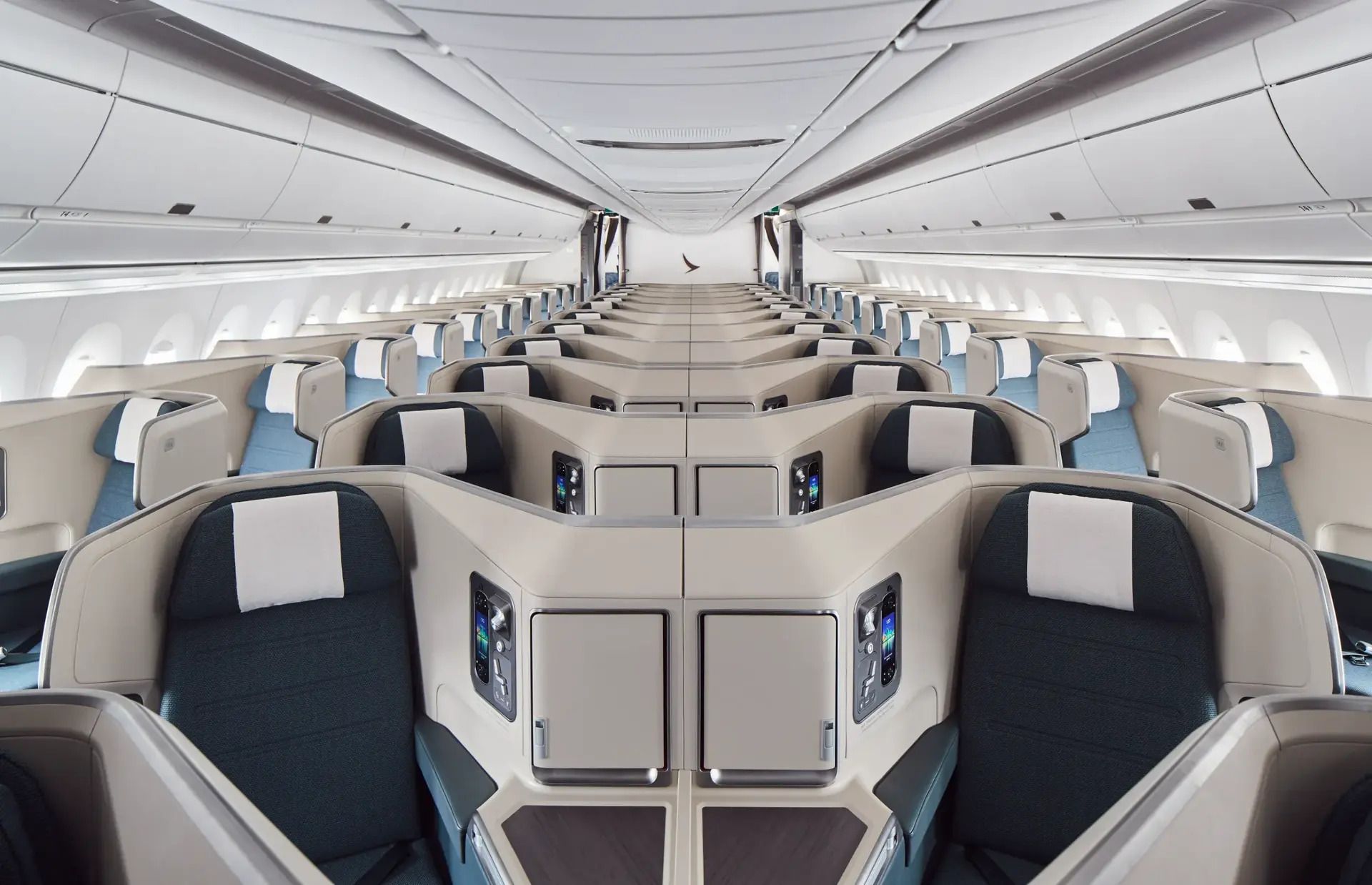 One stop each way on Cathay Pacific's A350-900. Cathay's reverse herringbone seats in a 1-2-1 layout give you fully flat beds with direct aisle access, plus excellent IFE and reliable Wi-Fi.