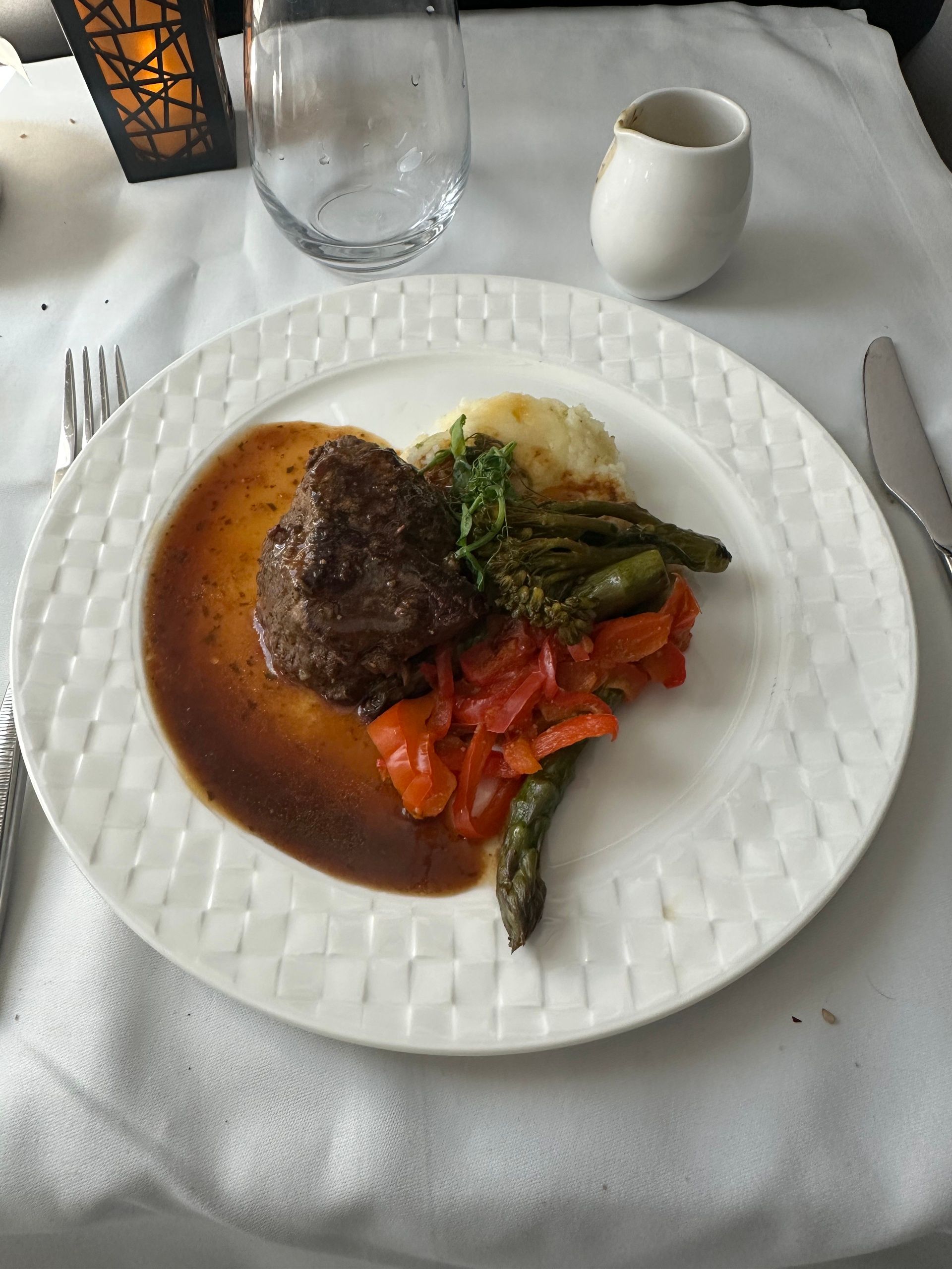 For the main, I had a beef tenderloin with mashed potatoes and vegetables. Steak on a plane is usually a gamble, but this one was cooked impressively well for 35,000 feet – not dry, nicely seasoned, and the mash was actually creamy, not glue.
