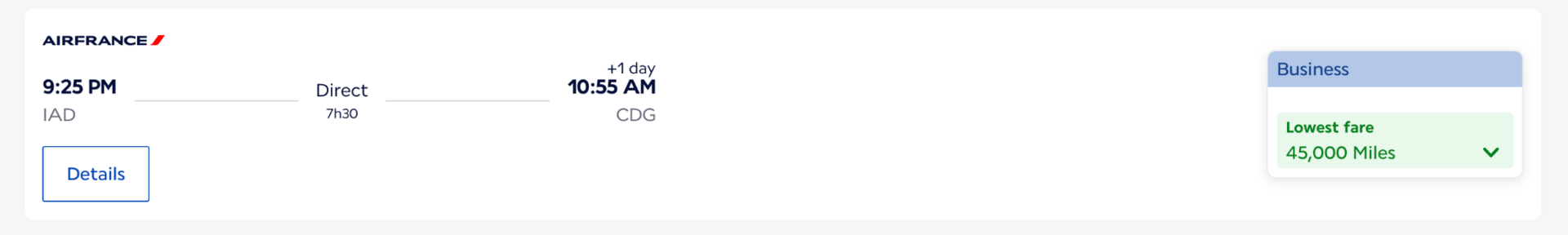 Washington, DC (IAD) → Paris (CDG), for 45,000 Flying Blue miles